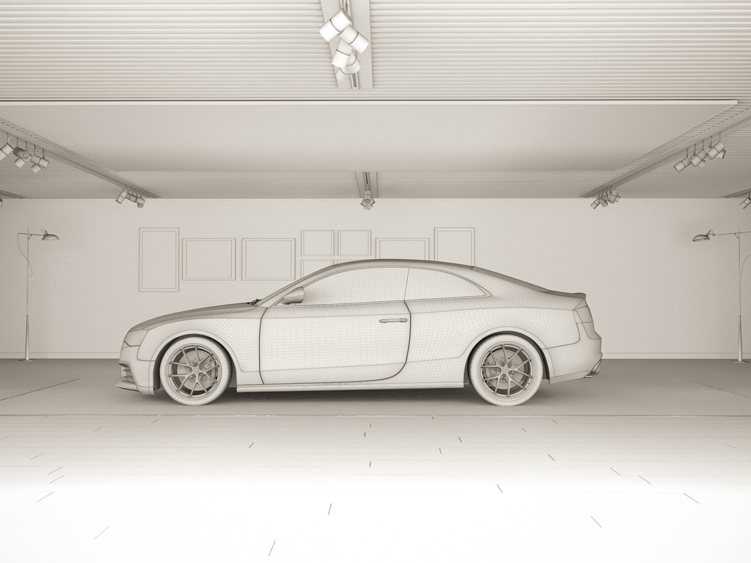 Full CG scene of an exhibition lounge or small TV studio with lighting
