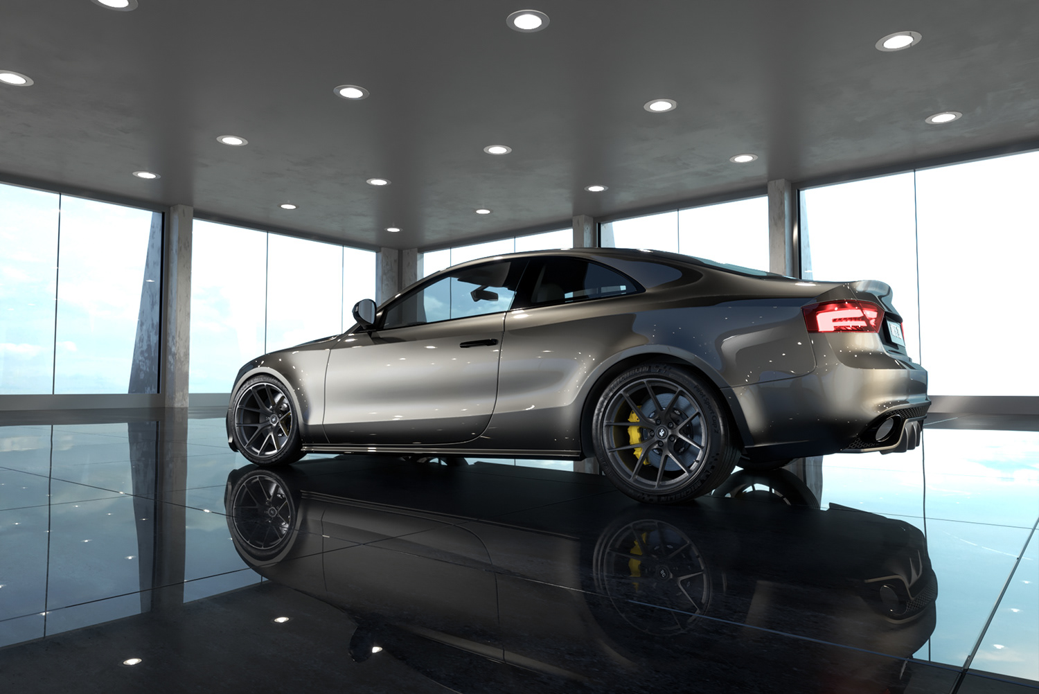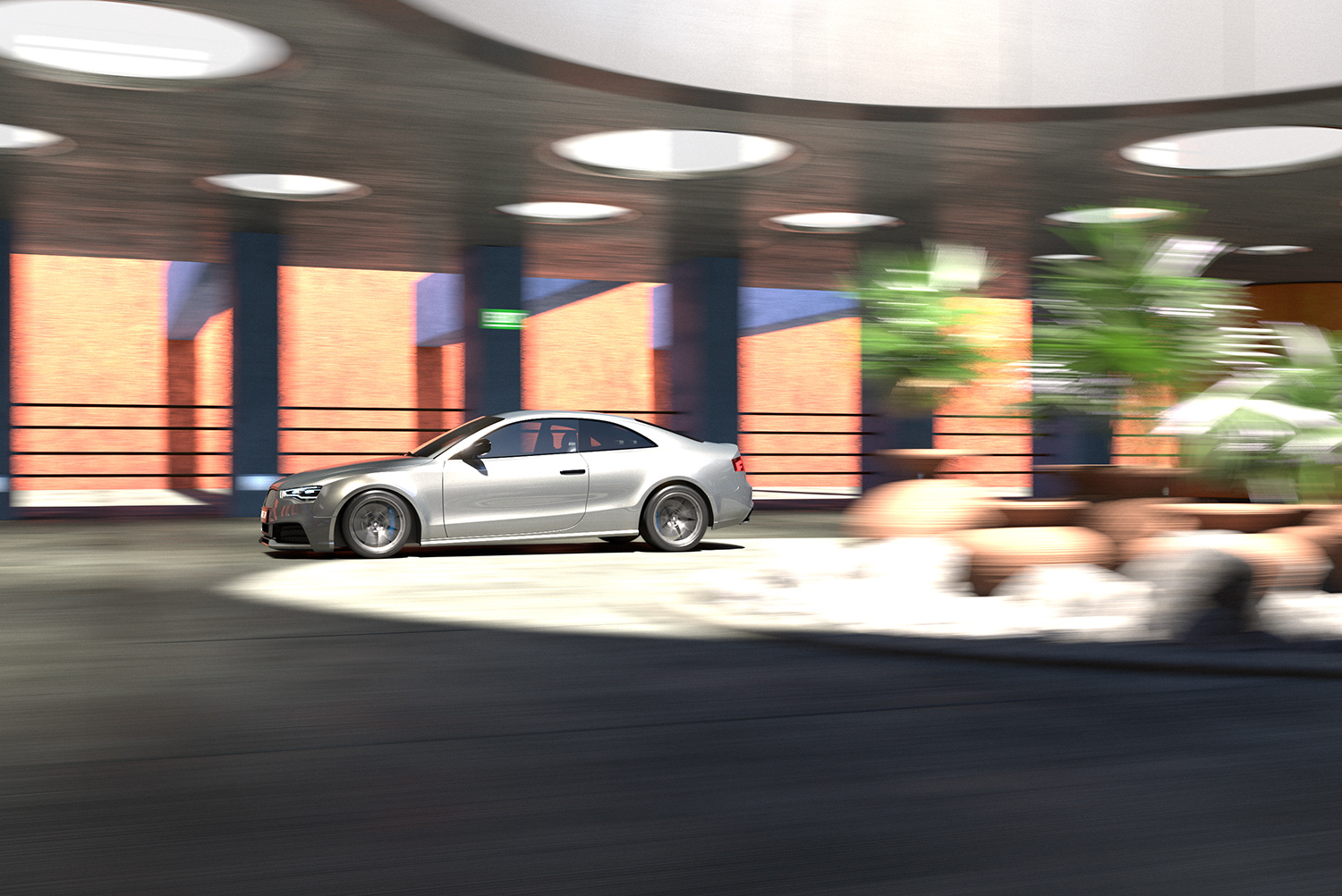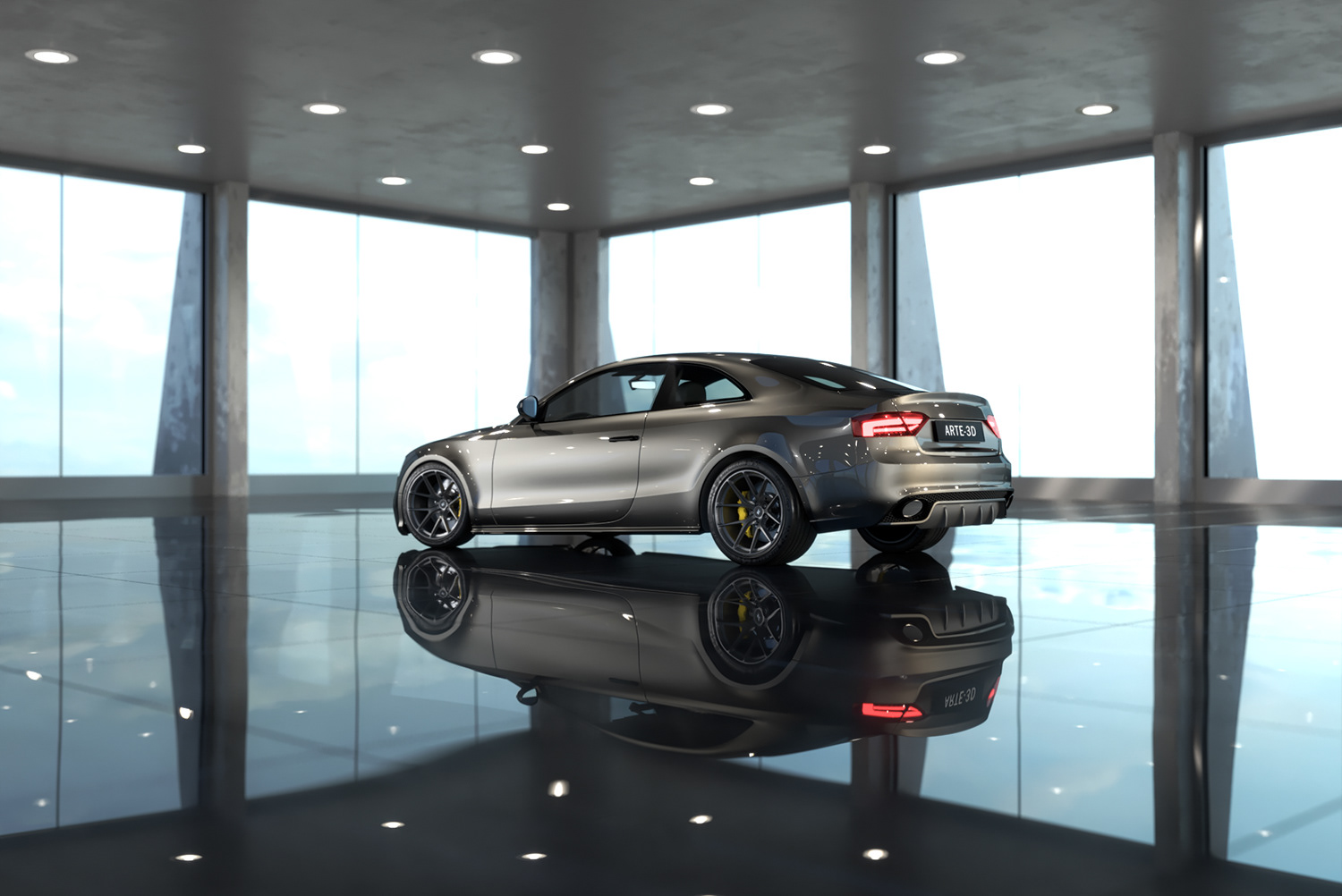 Interior Scene 14 is a full CGI scene consisting in a parking or show room with lighting and render setup ready to use with V-Ray
